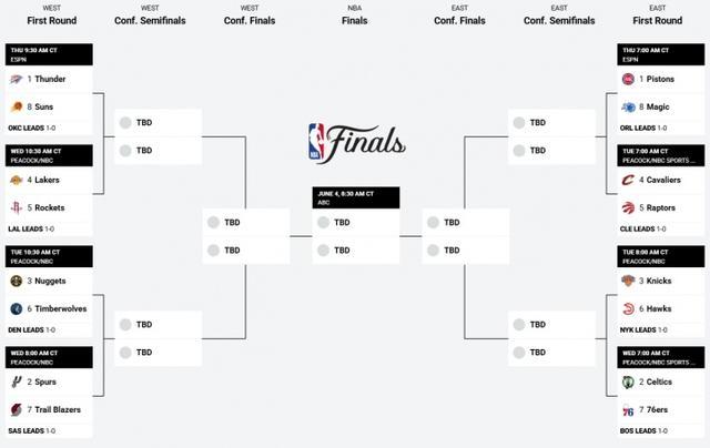 值得一提的是,除了魔术以8号种子对东部一号种子的活塞完成了下克上,其他所有对局都是排名更靠上的球队顺利获得比赛胜利,并且首轮G1最小分差都在9分以上。